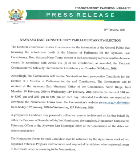 Prospective candidates may obtain nomination forms from the EC’s official site, www.ec.gov.gh/forms, starting Friday, January 16, 2026. The finished forms must be submitted in four copies, either in person by the candidate or by their proposer or seconder, during the designated nomination period.