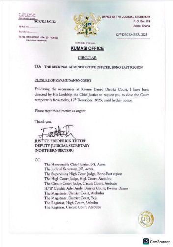“Following the occurrences at the Kwame Danso District Court, I have been directed by His Lordship the Chief Justice to request you to close the Court temporarily from today, 12 December 2025, until further notice,” a correspondence from the Judicial Service said.