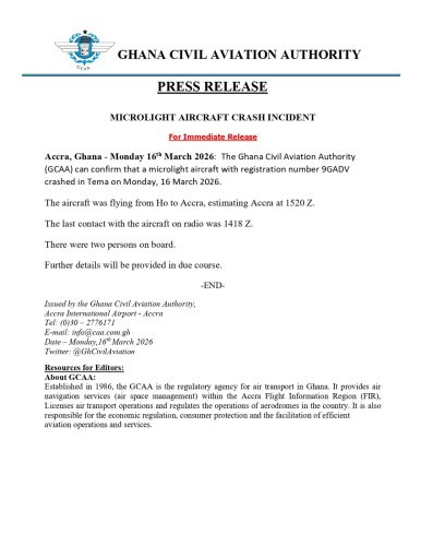 The Ghana Civil Aviation Authority (GCAA) has confirmed that a microlight plane bearing registration number 9GADV crashed in Tema on Monday, 16 March 2026.