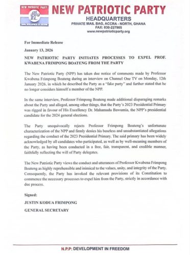 In a statement signed by the party’s General Secretary, Justin Kodua Frimpong, the NPP announced it had taken “due notice” of comments made by Prof Frimpong-Boateng on Channel One TV on Monday, 12 January 2026, where he explicitly stated that he no longer views himself as a member of the party.