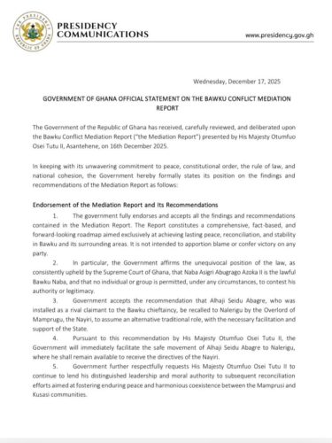 In a formal announcement made on Wednesday, December 17, and endorsed by the President’s Spokesperson, Felix Kwakye Ofosu, the government endorsed all suggestions in the report given the previous day, reiterating the Supreme Court’s stance on the legitimate Bawku overlord.