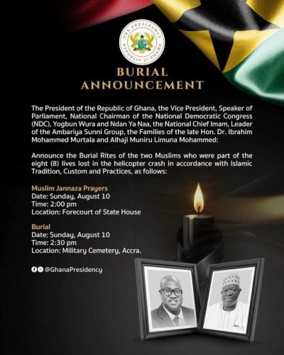 Burial ceremonies for former Environment Minister Dr. Ibrahim Mohammed Murtala and former Acting Deputy National Security Coordinator Alhaji Muniru Limuna Mohammed, two Muslim victims of the August 6 military helicopter disaster, have been confirmed by the Presidency.