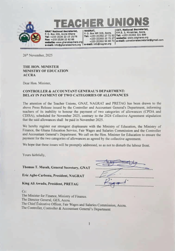 The Ghana National Association of Teachers (GNAT), the National Association of Graduate Teachers (NAGRAT), and the Pre-Tertiary Education Teachers Union of Ghana (PRETAG) are three well-known teacher unions that have criticized the government in response to a press release from the Controller and Accountant General’s Department (CAGD) stating that it is unable to pay two important allowances that are due in November 2025.